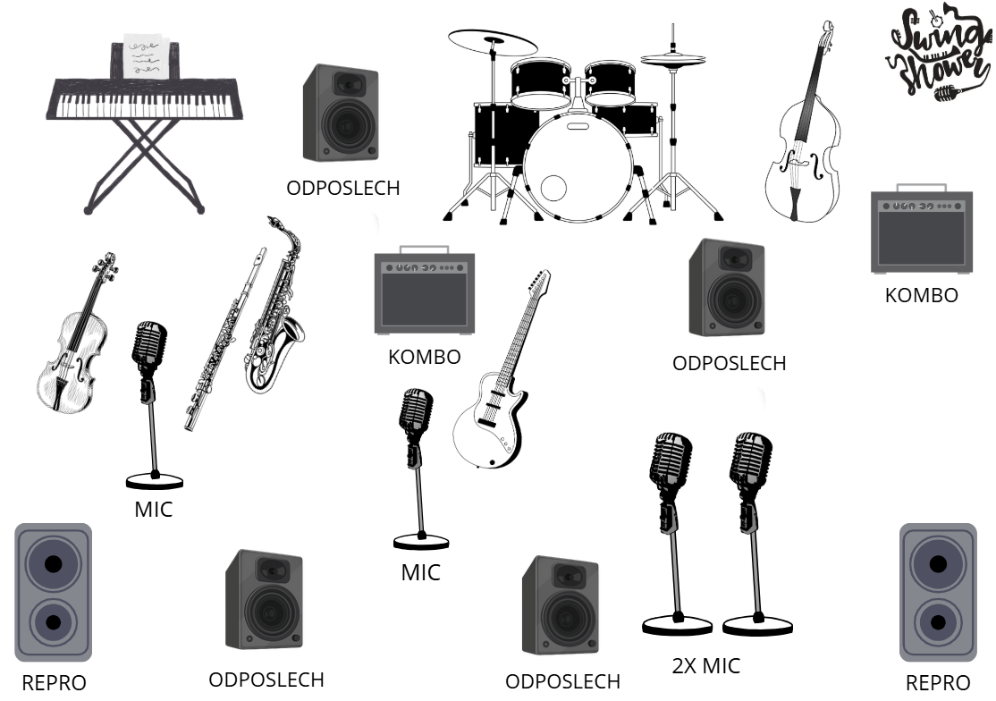 Poznámka: - Všechny mikrofony máme vlastní (4x Shure Super 55 Deluxe + 4x rovný stojan K&M)
